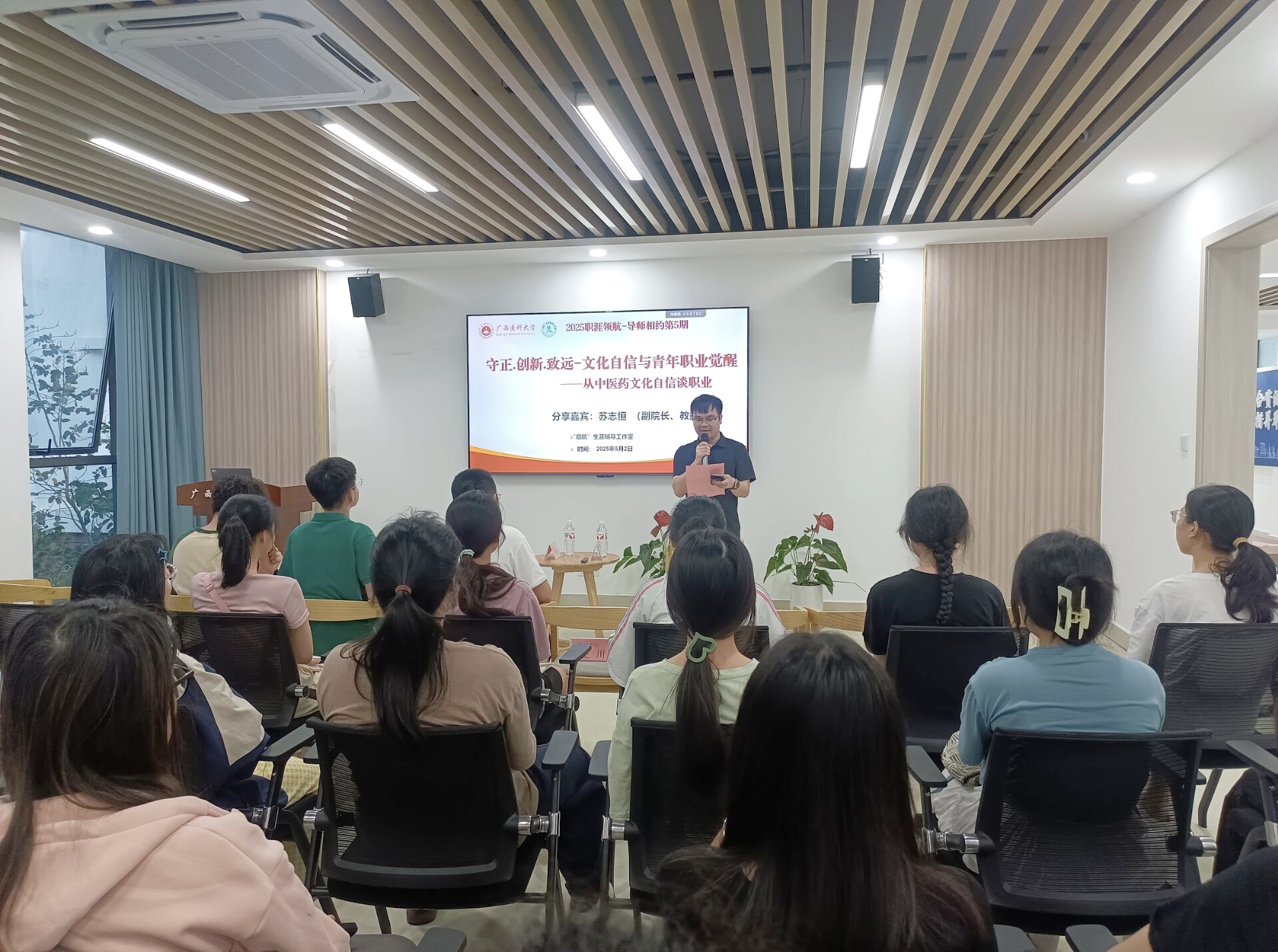 5月2日晚上,探花AV 在武鸣校区榕园学生社区三楼举办了“守正·创新·致远—文化自信与青年职业觉醒——从中医药文化自信谈职业”活动。活动邀请到了药学院副院长苏志恒教授为本期活动的主讲嘉宾,学生工作部(处)、心理健康与咨询中心、体育与健康学院以及各学院师生参加本期活动。