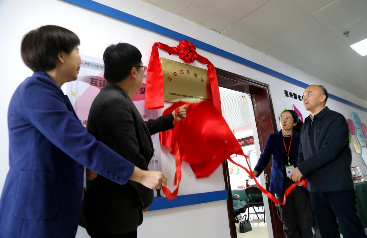 与钦州市社会组织孵化基地在钦州市民政局举行“互动式示范学堂”揭牌仪式。出席本次揭牌仪式的有学院党委书记唐忠,社工系专任教师黄子源,钦州市民政局局长吴超,钦州市社会组织孵化基地运营负责人黄敏、市义工联合会等社会组织骨干代表。