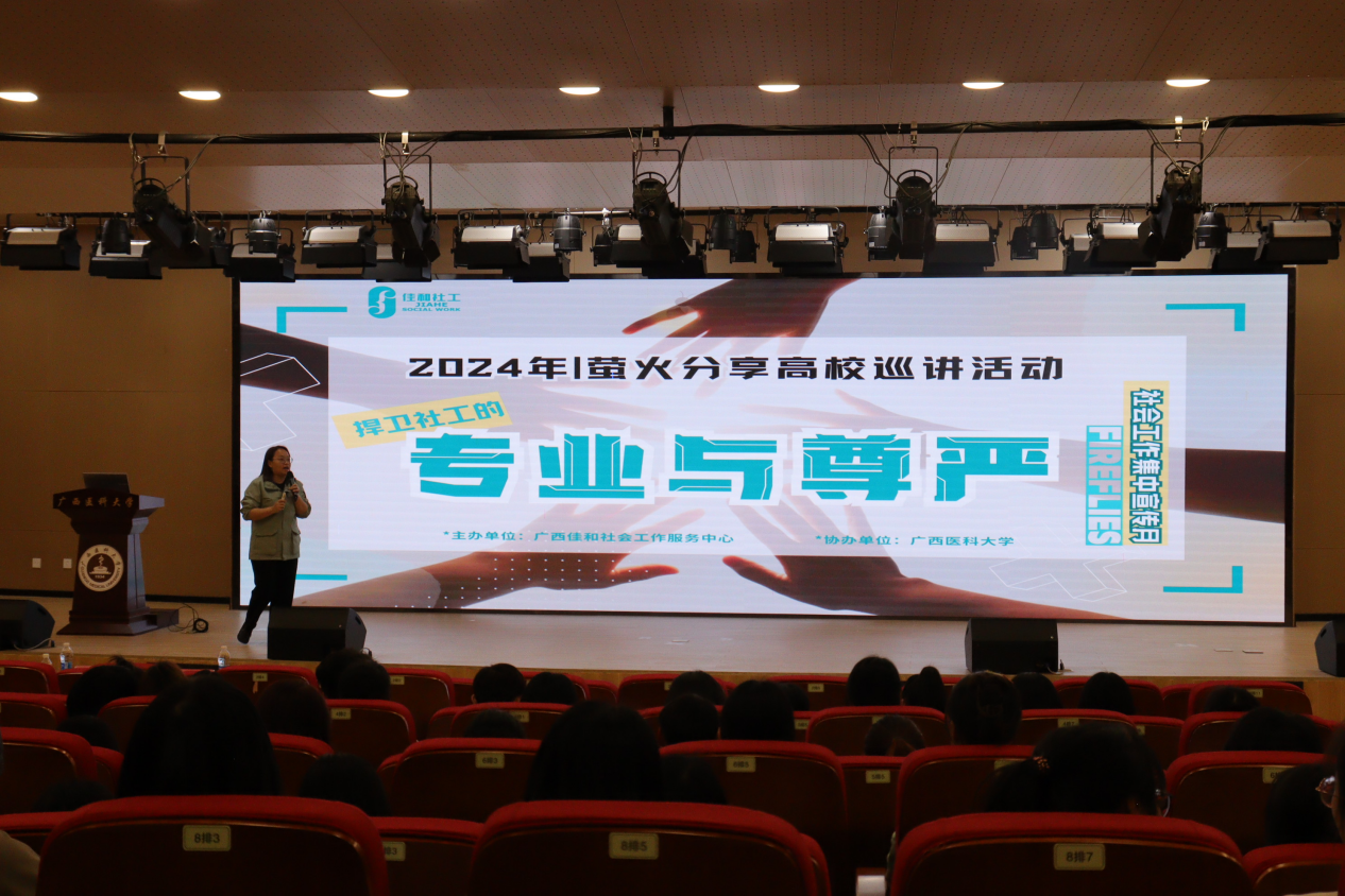 3月21日,探花AV 院邀请到广西佳和社会工作服务中心副总干事周小幸、督导评估部副部长吴蕾,在探花AV (武鸣校区)图书馆演讲厅开展“萤火分享”高校宣讲活动。活动由社会学与社会工作系副主任吴上老师主持,吸引了来自社会工作、养老服务管理、公共事业管理、运动康复、预防医学等专业的200余位同学参加。